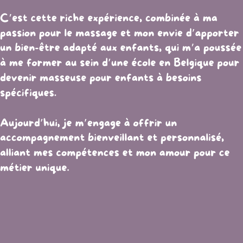Le massage pour enfants à besoins spécifiques est une approche adaptée de massage bien être destinée aux enfants présentant des conditions ou des besoins particuliers, tels que des troubles neurodéveloppementaux (comme l’autisme ou le TDAH), des handicaps physiques, des troubles sensoriels ou des conditions médicales chroniques.